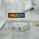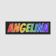 This fun, vibrant, multicolored name tag design features the common first name "ANGELINA", with the letters of the name having a colourful rainbow spectrum like gradient colouring pattern, on a black coloured background. A nametag like this might be worn by a staff member, an employee, or a volunteer whose given name is Angelina, to help identify the wearer to customers or other people. [~Z0000344]