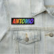 This fun, vibrant, multicolored name tag design features the common first name "ANTONIO", with the letters of the name having a colourful rainbow spectrum like gradient colouring pattern, on a black coloured background. A nametag like this might be worn by a staff member, an employee, or a customer service representative who is named Antonio, to help identify the wearer to others. [~Z0000344]
