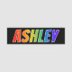 This fun, vibrant, multicolored name tag design features the common first name "ASHLEY", with the letters of the name having a colourful rainbow spectrum like gradient colouring pattern, on a black coloured background. A nametag like this might be worn by an employee, a staff member, or a volunteer whose name is Ashley, to help identify the wearer to customers or other people. [~Z0000344]
