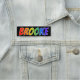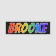 This fun, vibrant, multicolored name tag design features the common first name "BROOKE", with the letters of the name having a colourful rainbow spectrum like gradient colouring pattern, on a black coloured background. A nametag like this might be worn by a staff member, a volunteer, or an employee whose name is Brooke, to help identify the wearer to customers or other people. [~Z0000344]