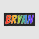 This fun, vibrant, multicolored name tag design features the common first name "BRYAN", with the letters of the name having a colourful rainbow spectrum like gradient colouring pattern, on a black coloured background. A nametag like this might be worn by a volunteer, a staff member, or a customer service representative whose first name is Bryan, to help identify the wearer to customers or other people. [~Z0000344]