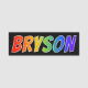 This fun, vibrant, multicolored name tag design features the common first name "BRYSON", with the letters of the name having a colourful rainbow spectrum like gradient colouring pattern, on a black coloured background. A nametag like this might be worn by a customer service representative, an employee, or a volunteer named Bryson, to help identify the wearer to customers or other people. [~Z0000344]