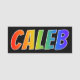 This fun, vibrant, multicolored name tag design features the common first name "CALEB", with the letters of the name having a colourful rainbow spectrum like gradient colouring pattern, on a black coloured background. A nametag like this might be worn by a staff member, a customer service representative, or a volunteer named Caleb, to help identify the wearer to customers or other people. [~Z0000344]