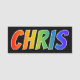This fun, vibrant, multicolored name tag design features the common first name "CHRIS", with the letters of the name having a colourful rainbow spectrum like gradient colouring pattern, on a black coloured background. A nametag like this might be worn by a staff member, a customer service representative, or a volunteer whose given name is Chris, to help identify the wearer to customers or other people. [~Z0000344]