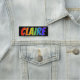 This fun, vibrant, multicolored name tag design features the common first name "CLAIRE", with the letters of the name having a colourful rainbow spectrum like gradient colouring pattern, on a black coloured background. A nametag like this might be worn by a customer service representative, an employee, or a volunteer whose first name is Claire, to help identify the wearer to others. [~Z0000344]