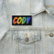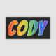 This fun, vibrant, multicolored name tag design features the common first name "CODY", with the letters of the name having a colourful rainbow spectrum like gradient colouring pattern, on a black coloured background. A nametag like this might be worn by an employee, a staff member, or a customer service representative who is named Cody, to help identify the wearer to others. [~Z0000344]