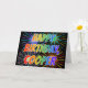 This vibrant, multicolored and fun birthday greeting card design features the message "HAPPY BIRTHDAY," and the common first name "COOPER" with the letters having a colourful rainbow spectrum like gradient colouring pattern. The background of the front also features a colourful bursting fireworks inspired pattern. The inside features a personalised greeting message, or could perhaps be cleared and left blank if a message is to be written by hand instead. A greeting card like this might be a fun way to send a personalised birthday message to somebody named Cooper. [~Z0000350]
