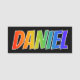 This fun, vibrant, multicolored name tag design features the common first name "DANIEL", with the letters of the name having a colourful rainbow spectrum like gradient colouring pattern, on a black coloured background. A nametag like this might be worn by a volunteer, an employee or a customer service representative named Daniel, to help identify the wearer to customers or other people. [~Z0000344]
