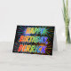 This multicolored and fun birthday greeting card design features the message "HAPPY BIRTHDAY," and the common first name "DERRICK" with the letters having a colourful rainbow spectrum like gradient colouring pattern. The background of the front also features a colourful pattern inspired by the appearance of bursting fireworks. The inside features a customised greeting message, or could perhaps be cleared and left blank if a message is to be written by hand instead. This might be a fun way to acknowledge the birthday of somebody named Derrick. [~Z0000350]