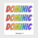 This multicolored, fun, and vibrant sticker design features the common first name or given name "DOMINIC", with the letters of the name featuring a colourful rainbow spectrum like gradient colouring pattern. It might be a fun gift to give to somebody whose given name is Dominic. [~Z0000361]