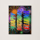 This exciting, lively, birthday-themed jigsaw puzzle design features the message "HAPPY BIRTHDAY, ELIANA" having a colorful rainbow spectrum inspired gradient pattern, and a fun bursting celebratory fireworks inspired background pattern. A colorful puzzle like this might be a fun way to acknowledge the birthday of somebody named Eliana. [~Z0000465]