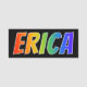 This fun, vibrant, multicolored name tag design features the common first name "ERICA", with the letters of the name having a colourful rainbow spectrum like gradient colouring pattern, on a black coloured background. A nametag like this might be worn by a volunteer, a staff member, or an employee who is named Erica, to help identify the wearer to customers or other people. [~Z0000344]