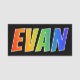 This fun, vibrant, multicolored name tag design features the common first name "EVAN", with the letters of the name having a colourful rainbow spectrum like gradient colouring pattern, on a black coloured background. A nametag like this might be worn by a volunteer, an employee, or a staff member whose given name is Evan, to help identify the wearer to others. [~Z0000344]