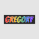 This fun, vibrant, multicolored name tag design features the common first name "GREGORY", with the letters of the name having a colourful rainbow spectrum like gradient colouring pattern, on a black coloured background. A nametag like this might be worn by an employee, a customer service representative, or a staff member who is named Gregory, to help identify the wearer to customers or other people. [~Z0000344]