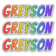 This vibrant, multicolored, and exciting sticker design features the common first name or given name "GREYSON", with the letters of the name featuring a colourful rainbow spectrum like gradient colouring pattern. It might be a fun present to give to somebody named Greyson. [~Z0000361]