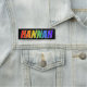 This fun, vibrant, multicolored name tag design features the common first name "HANNAH", with the letters of the name having a colourful rainbow spectrum like gradient colouring pattern, on a black coloured background. A nametag like this might be worn by an employee, a customer service representative, or a staff member whose name is Hannah, to help identify the wearer to others. [~Z0000344]