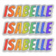 This multicolored, fun, and vibrant sticker design features the common first name or given name "ISABELLE", with the letters of the name featuring a colourful rainbow spectrum inspired gradient colouring pattern. It might be a fun present to give to somebody named Isabelle. [~Z0000361]