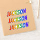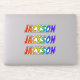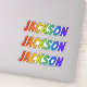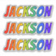 This vibrant, fun, and exciting sticker design features the common first name or given name "JACKSON", with the letters of the name featuring a colourful rainbow spectrum like gradient colouring pattern. It might be a fun gift to give to somebody named Jackson. [~Z0000361]