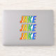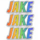 This fun, multicolored, and vibrant sticker design features the common first name or given name "JAKE", with the letters of the name featuring a colourful rainbow spectrum like gradient colouring pattern. It might be a fun present to give to somebody named Jake. [~Z0000361]