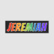 This fun, vibrant, multicolored name tag design features the common first name "JEREMIAH", with the letters of the name having a colourful rainbow spectrum like gradient colouring pattern, on a black coloured background. A nametag like this might be worn by a volunteer, an employee, or a staff member whose first name is Jeremiah, to help identify the wearer to customers or other people. [~Z0000344]