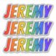 This fun, exciting, and vibrant sticker design features the common first name or given name "JEREMY", with the letters of the name having a colourful rainbow spectrum inspired gradient colouring pattern. It might be a fun present to give to somebody named Jeremy. [~Z0000361]