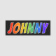 This fun, vibrant, multicolored name tag design features the common first name "JOHNNY", with the letters of the name having a colourful rainbow spectrum like gradient colouring pattern, on a black coloured background. A nametag like this might be worn by a staff member, a volunteer, or a customer service representative whose name is Johnny, to help identify the wearer to customers or other people. [~Z0000344]