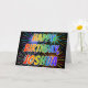 This vibrant, multicolored and fun birthday greeting card design features the message "HAPPY BIRTHDAY," and the common first name "JOSHUA" with the letters having a colourful rainbow spectrum like gradient colouring pattern. The background of the front also features a colourful pattern inspired by the appearance of bursting celebratory fireworks. The inside features a customised greeting message, or could perhaps be cleared and left blank if a message is to be written by hand instead. This might be a fun way to acknowledge the birthday of somebody named Joshua. [~Z0000350]