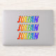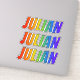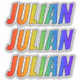 This vibrant, multicolored, and exciting sticker design features the common first name or given name "JULIAN", with the letters of the name having a colourful rainbow spectrum like gradient colouring pattern. It might be a fun present to give to somebody who is named Julian. [~Z0000361]