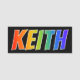 This fun, vibrant, multicolored name tag design features the common first name "KEITH", with the letters of the name having a colourful rainbow spectrum like gradient colouring pattern, on a black coloured background. A nametag like this might be worn by a customer service representative, a staff member, or a volunteer named Keith, to help identify the wearer to customers or other people. [~Z0000344]