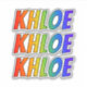 This fun, multicolored, and exciting sticker design features the common first name or given name "KHLOE", with the letters of the name featuring a colourful rainbow spectrum like gradient colouring pattern. It might be a fun gift to give to somebody named Khloe. [~Z0000361]