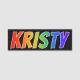 This fun, vibrant, multicolored name tag design features the common first name "KRISTY", with the letters of the name having a colourful rainbow spectrum like gradient colouring pattern, on a black coloured background. A nametag like this might be worn by a customer service representative, an employee, or a staff member whose name is Kristy, to help identify the wearer to customers or other people. [~Z0000344]