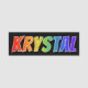 This fun, vibrant, multicolored name tag design features the common first name "KRYSTAL", with the letters of the name having a colourful rainbow spectrum like gradient colouring pattern, on a black coloured background. A nametag like this might be worn by an employee, a staff member, or a volunteer whose name is Krystal, to help identify the wearer to others. [~Z0000344]