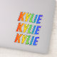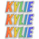 This vibrant, exciting, and fun sticker design features the common first name or given name "KYLIE", with the letters of the name having a colourful rainbow spectrum inspired gradient colouring pattern. It might be a fun present to give to somebody whose first name is Kylie. [~Z0000361]