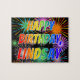 This lively and exciting birthday-themed jigsaw puzzle design has the message "HAPPY BIRTHDAY, LINDSAY" having a colorful rainbow spectrum inspired gradient pattern, and a fun bursting celebratory fireworks inspired background pattern. A colorful puzzle like this might be used to send a birthday greeting message to somebody named Lindsay. [~Z0000465]