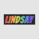 This fun, vibrant, multicolored name tag design features the common first name "LINDSAY", with the letters of the name having a colourful rainbow spectrum like gradient colouring pattern, on a black coloured background. A nametag like this might be worn by a staff member, a volunteer, or an employee who is named Lindsay, to help identify the wearer to others. [~Z0000344]