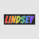 This fun, vibrant, multicolored name tag design features the common first name "LINDSEY", with the letters of the name having a colourful rainbow spectrum like gradient colouring pattern, on a black coloured background. A nametag like this might be worn by a customer service representative, a volunteer, or a staff member whose name is Lindsey, to help identify the wearer to customers or other people. [~Z0000344]