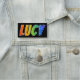 This fun, vibrant, multicolored name tag design features the common first name "LUCY", with the letters of the name having a colourful rainbow spectrum like gradient colouring pattern, on a black coloured background. A nametag like this might be worn by a staff member, a volunteer, or an employee whose first name is Lucy, to help identify the wearer to others. [~Z0000344]