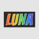 This fun, vibrant, multicolored name tag design features the common first name "LUNA", with the letters of the name having a colourful rainbow spectrum like gradient colouring pattern, on a black coloured background. A nametag like this might be worn by a staff member, a volunteer, or an employee whose first name is Luna, to help identify the wearer to customers or other people. [~Z0000344]