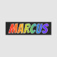 This fun, vibrant, multicolored name tag design features the common first name "MARCUS", with the letters of the name having a colourful rainbow spectrum like gradient colouring pattern, on a black coloured background. A nametag like this might be worn by a volunteer, an employee, or a staff member who is named Marcus, to help identify the wearer to others. [~Z0000344]