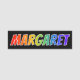 This fun, vibrant, multicolored name tag design features the common first name "MARGARET", with the letters of the name having a colourful rainbow spectrum like gradient colouring pattern, on a black coloured background. A nametag like this might be worn by a customer service representative, an employee, or a volunteer named Margaret, to help identify the wearer to others. [~Z0000344]