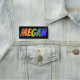 This fun, vibrant, multicolored name tag design features the common first name "MEGAN", with the letters of the name having a colourful rainbow spectrum like gradient colouring pattern, on a black coloured background. A nametag like this might be worn by a volunteer, a customer service representative, or an employee whose first name is Megan, to help identify the wearer to customers or other people. [~Z0000344]