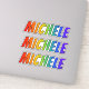 This fun, exciting, and multicolored sticker design features the common first name or given name "MICHELE", with the letters of the name having a colourful rainbow spectrum inspired gradient colouring pattern. It might be a fun present to give to somebody whose given name is Michele. [~Z0000361]