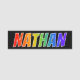 This fun, vibrant, multicolored name tag design features the common first name "NATHAN", with the letters of the name having a colourful rainbow spectrum like gradient colouring pattern, on a black coloured background. A nametag like this might be worn by a volunteer, an employee, or a staff member whose first name is Nathan, to help identify the wearer to others. [~Z0000344]