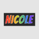 This fun, vibrant, multicolored name tag design features the common first name "NICOLE", with the letters of the name having a colourful rainbow spectrum like gradient colouring pattern, on a black coloured background. A nametag like this might be worn by an employee, a volunteer, or a staff member whose first name is Nicole, to help identify the wearer to customers or other people. [~Z0000344]