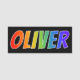 This fun, vibrant, multicolored name tag design features the common first name "OLIVER", with the letters of the name having a colourful rainbow spectrum like gradient colouring pattern, on a black coloured background. A nametag like this might be worn by a customer service representative, a volunteer, or an employee whose first name is Oliver, to help identify the wearer to customers or other people. [~Z0000344]