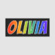 This fun, vibrant, multicolored name tag design features the common first name "OLIVIA", with the letters of the name having a colourful rainbow spectrum like gradient colouring pattern, on a black coloured background. A nametag like this might be worn by a staff member, a volunteer, or an employee named Olivia, to help identify the wearer to others. [~Z0000344]