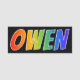 This fun, vibrant, multicolored name tag design features the common first name "OWEN", with the letters of the name having a colourful rainbow spectrum like gradient colouring pattern, on a black coloured background. A nametag like this might be worn by a volunteer, an employee, or a staff member whose name is Owen, to help identify the wearer to others. [~Z0000344]