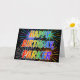 This multicolored and fun birthday greeting card design features the message "HAPPY BIRTHDAY," and the common first name "PARKER" with the letters having a colourful rainbow spectrum like gradient colouring pattern. The background of the front also features a colourful pattern inspired by the appearance of bursting fireworks. The inside features a custom greeting message, or could perhaps be cleared and left blank if a message is to be written by hand instead. This might be a fun way to acknowledge the birthday of somebody named Parker. [~Z0000350]