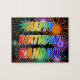 This fun and exciting birthday-themed jigsaw puzzle design has the message "HAPPY BIRTHDAY, RANDALL" having a colourful rainbow spectrum inspired gradient pattern, and a vibrant bursting celebratory fireworks inspired background pattern. A colourful puzzle like this might be a fun way to send birthday greetings to somebody named Randall. [~Z0000465]