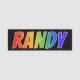 This fun, vibrant, multicolored name tag design features the common first name "RANDY", with the letters of the name having a colourful rainbow spectrum like gradient colouring pattern, on a black coloured background. A nametag like this might be worn by a volunteer, an employee, or a staff member whose name is Randy, to help identify the wearer to customers or other people. [~Z0000344]